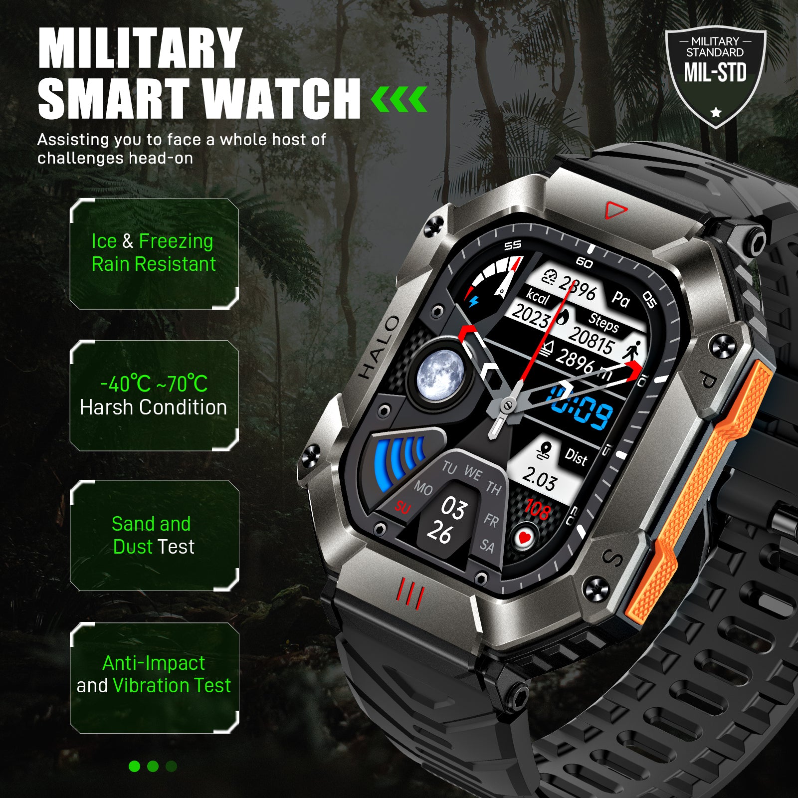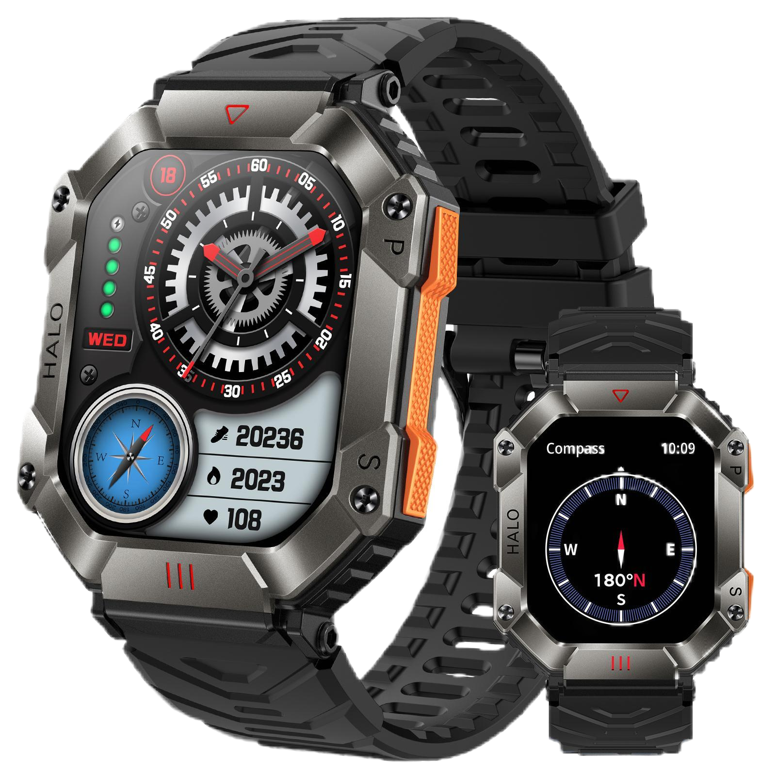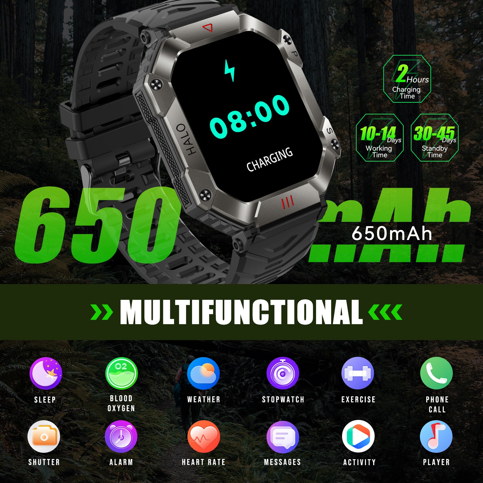 The bezel and decorative parts are made of imported plastic + high-quality zinc alloy ring, and the watch body is sturdy by adopting the craftsmanship of military standards. Receive the test of heat resistance/smoke/low pressure/sand/liquid pollution/rain/shock and so on harsh environment.KR80 is a smartwatch specially made for men.